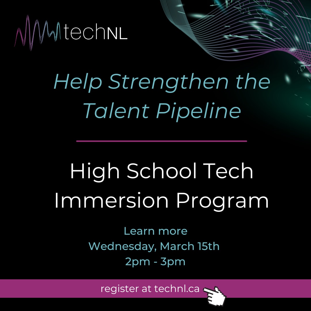 If you missed the last session and want to learn more, please join us for an informational session on the techNL High School Tech Immersion Program on Wednesday, March 15 at 2:00 pm. You will learn about the program and its impacts and hear past employers and students share their stories.